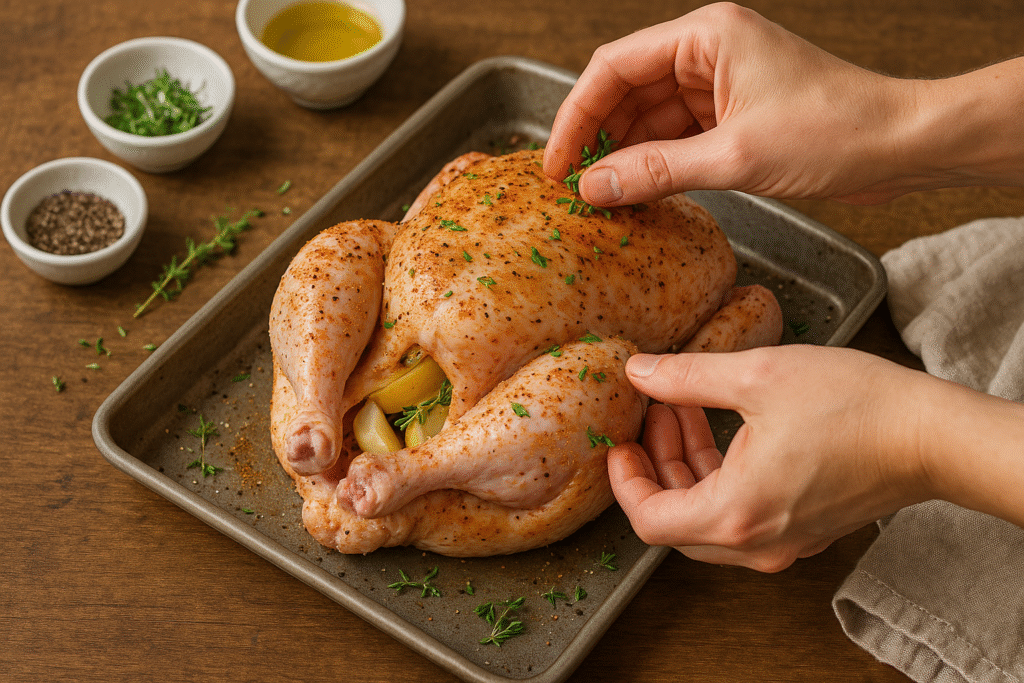 4. Sprinkle the fresh thyme over the chicken. Place breast-side up in a roasting pan.